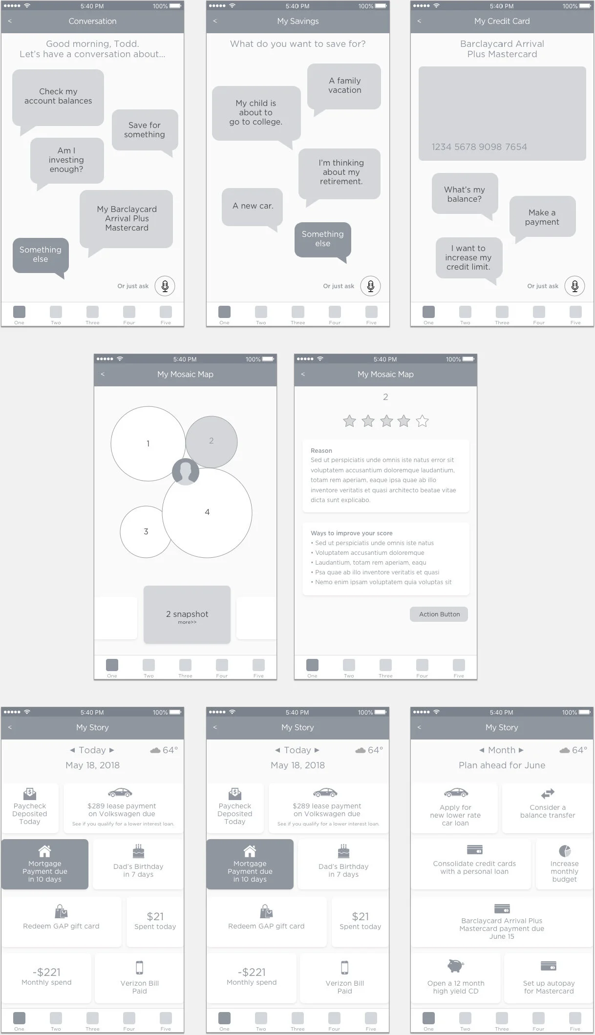 The initial immersion phase of design surfaced three interaction concept models: Conversation Starters, Mosaic Map, & Storybook. Each concept had its own approach to providing valuable insights into a consumer’s finances.
