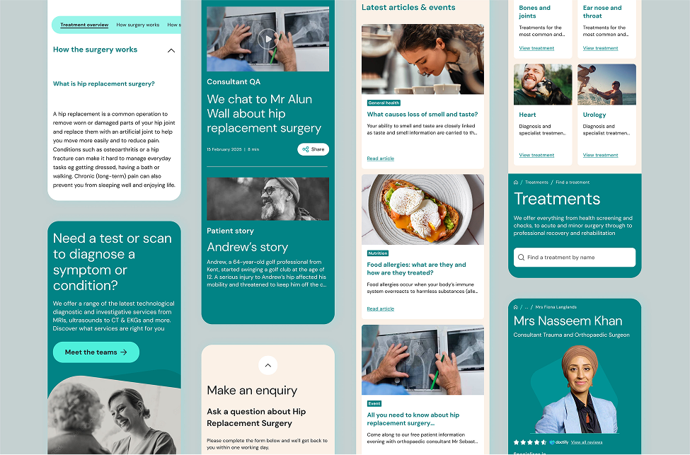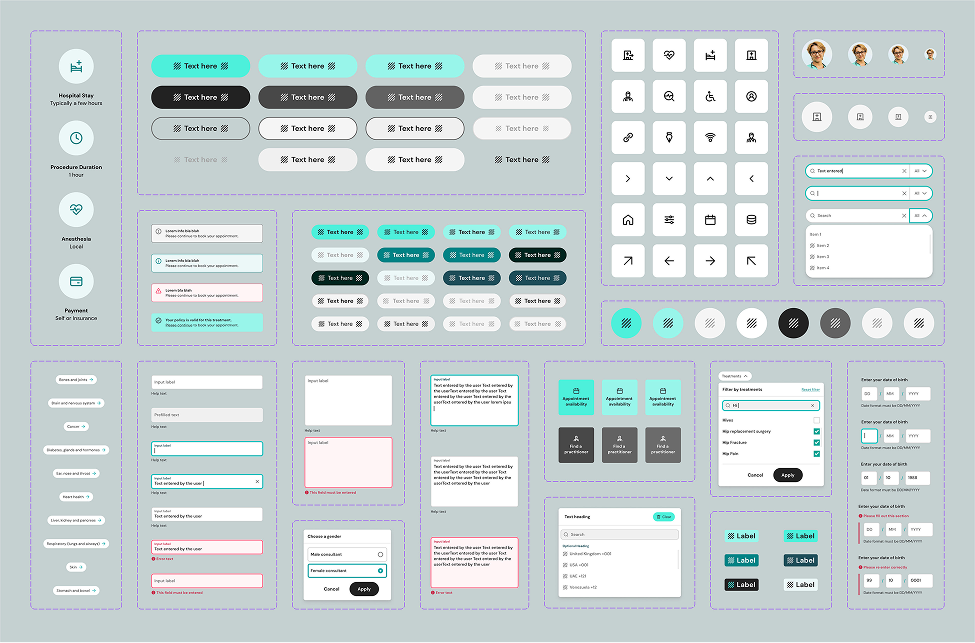 To ensure consistency and scalability across all digital touch points a comprehensive Design System was developed and aligned with Spire Healthcare’s visual rebrand. Reusable components and interaction patterns were developed for: